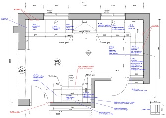 We produce kitchen plans and elevations for homeowners and professionals (architects, interior designers, etc). Some clients require drawings for bespoke kitchen joinery while others need drawings of a kitchen design based on products from high street kitchen retailers. Kitchen drawings can also include electrical socket and switch positions as well as specific kitchen appliances. | ![]() |
